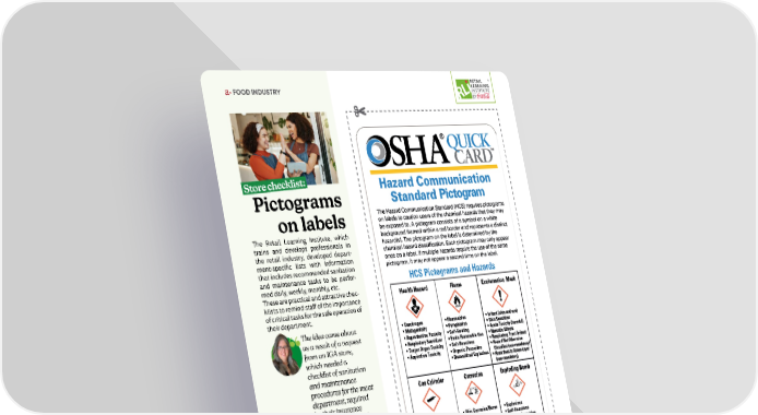 84 Enero | Febrero 2026 abasto.com The Retail Learning Institute, which trains and develops professionals in the retail industry, developed depart- ment-specific lists with information that includes recommended sanitation and maintenance tasks to be perfor- med daily, weekly, monthly, etc. These are practical and attractive chec- klists to remind staff of the importance of critical tasks for the safe operation of their department. The idea came about as a result of a request from an IGA store, which needed a checklist of sanitation and maintenance procedures for the meat department, required by their insurance company and useful for reducing premium costs. Ana Velzquez vice president of the Institute. Cut out this list for your store and consult this and other documents in English and Spanish on the Re- tail Learning Institute website. FOR MORE INFO RETAIL LEARNING INSTITUTE / EDUCATIONAL MATERIAL Pictograms on labels Store checklist: FOOD INDUSTRY
