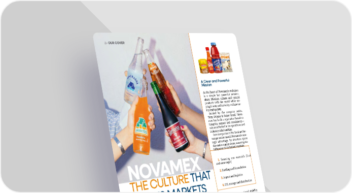 30 Enero | febrero 2026 abasto.com OUR COVER BY ABASTO W hat began as a small team delivering be- loved Mexican sodas like Jarritos, Sidral Mundet and Sangra Seorial to families longing for the flavors of home has grown into a vertically integrated giant. This is the story of how Mexican authenticity conque- red the U.S. market. Four decades later, Novamex stands as a fully vertically integra- ted company, present in more than a dozen beverage and grocery cate- gories, hundreds of SKUs, and tens of thousands of distribution points across the country. NOVAMEX THE CULTURE THAT MOVES MARKETS What began as a small team bringing the flavors of home to nostalgic families is now a vertically integrated giant. This is the story of how Mexican authenticity conquered the U.S. market A Clear and Powerful Mission At the heart of Novamexs evolution is a simple but powerful mission: share Mexican culture and natural products with the world while sta- ying true to authenticity, craftsmans- hip and quality. Guided by the company motto, Stay Unique & Super Good, Nova- mex has built a reputation based on integrity, respect and consistency values reflected in its operations and industry relationships. Few companies in the food and be- verage sector match Novamexs stra- tegic advantage. Its structure spans the entire supply chain, ensuring sta- bility even in turbulent markets: 1. Sourcing raw materials (fruit and cane sugar) 2. Bottling and formulation 3. Import and logistics 4. U.S. storage and distribution This ensures operational stability and reliable supply even in challen- ging market conditions. A Stellar Portfolio Novamex is more than sodas. Its ca- talog includes iconic, culturally roo- ted brands: Carbonated beverages: Jarritos, Sidral Mundet, Sangra Seorial, Mineragua, Tepachito, Sana Sana Wellness and natural: C2O Co- conut Water, Steaz Tea, Waikea Water Pantry and sweets: Chocolate Ibarra, DGari, Salsa La Perrona, Camaronazo