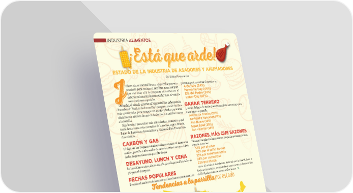 INDUSTRIA ALIMENTOS ¡Está que arde! Estado de la industria de asadores y ahumadores Por Violeta Montes de Oca ulio es el mes nacional de asar a la parrilla, pero este personas gustan cocinar al exterior en: artefacto para cocinar al aire libre suma adeptos 4 de julio (54%) Jque van más allá de preparar alimentos en el Memorial Day (44%) exterior solamente durante dicho mes, el verano Día del Padre (34%) o en ocasiones especiales. Labor Day (47%) De hecho, el sábado anterior al Memorial Day se ha ganado el nombre de “Back to Barbecue Day” porque es uno de los días GANAN TERRENO más concurridos para comprar un asador y fecha que marca Los días de 昀椀esta de otoño e invierno también son excusa para o昀椀cialmente el inicio de que en el aire huela a carbón o carne hacer algo a la parrilla. a la parrilla. Acción de Gracias (20%) Siga leyendo para saber más sobre fechas, alimentos y qué Navidad o Hanukkah (11%) tanta fama suma esta extensión de la cocina, según Hearth, Año Nuevo (14%) Patio & Barbecue Association y National Fire Protection Super Bowl (30%) Association. San Valentín (14%) CARBÓN Y GAS RAZONES, MÁS QUE SAZONES El 64% de los hogares estadounidenses posee al menos un Estas son las principales causas por las que las personas cocinan asador, parrilla o ahumador de exterior, mientras que el 61% lejos de la cocina: de los hogares tiene una parrilla de gas 57% por el sabor 40% por el estilo de vida DESAYUNO, LUNCH Y CENA 33% por entretenimiento En los últimos años, el 12% asa a la parrilla para el brunch y el 29% por comodidad 7% para el desayuno. 23% por afición Nota: El estado de la industria, elaborado por la Hearth, Patio & FECHAS POPULARES Barbecue Association, es resultado de una encuesta en línea que hizo Prender el asador va de la mano con las altas temperaturas. Las Rockbridge Associates Inc. en septiembre de 2021. Tendencias a la parrilla por estado Maiz Res o cerdo Pollo Seafood Otros 3838 JJUULLIIOO//AAGGOOSSTTO 2O 200224 4 AABBAASSTOTO..CCOOMM