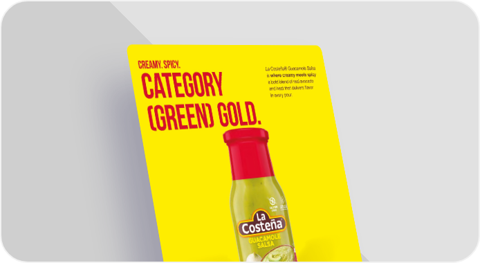 Category (Green) Gold. La Costeña® Guacamole Salsa is where creamy meets spicy a bold blend of real avocado and heat that delivers flavor in every pour. Perfect for retail or foodservice. No chopping, no mashing – Just open, pour and serve. Creamy. Spicy. vilore.com Sales@vilore.com