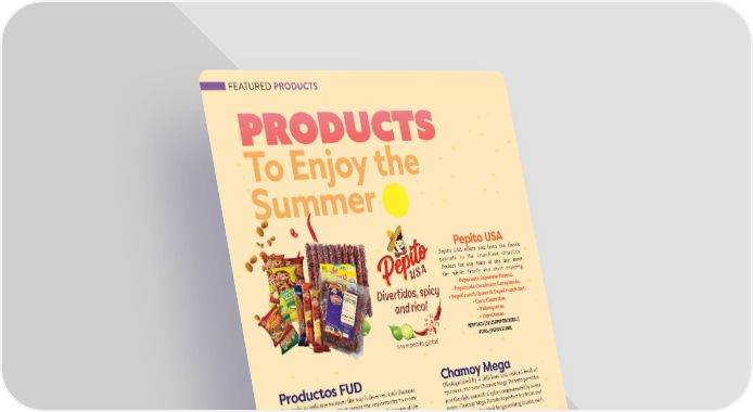 FEATURED PRODUCTS Products To Enjoy the Summer Pepito USA Pepito USA offers you from the classic peanuts to the crunchiest churritos. Perfect for any time of the day, meet the whole family and start enjoying: - Pepecuate Japanese Peanut. - Pepecuate Cacahuate Garapiñado. • PepeCrunch Queso & PepeCrunch Hot. • Corn Churritos. • Palanquetas. • PepeDonas. PEPITO USA | [email protected] | HTTPS://PEPITO.GLOBAL Productos FUD Chamoy Mega Get ready to welcome summer the way it deserves! Let's Summer Distinguished by a delicious and refined level of with FUD is here, and with it comes the opportunity to create spiciness, the new Chamoy Mega Picosito provides unforgettable memories with your family. Turn afternoons at the just the right amount of spice complemented by sweet pool, soccer and games into something special by pairing your meals notes. Chamoy Mega Picosito is perfect for fruits and with our stars of the season: Hot Links, Hot Dogs and FUD Hams. vegetables. It is also ideal for garnishing drinks, such BAR-S FOODS – A SIGMA COMPANY as margaritas or mangonadas. WWW.FUDUSA.COM | 1-800-699-4115 MEGA ALIMENT0S | WWW.MEGA-FOODS.COM | 972-482-7708 1010 JJUULLYY//AAUUGGUUSST 2T 200224 4 AABBAASSTOTO..CCOOMM