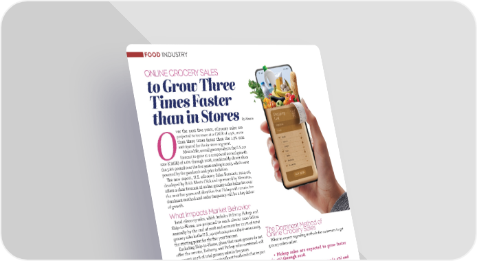 FOOD INDUSTRY ONLINE GROCERY SALES to Grow Three Times Faster than in Stores By Abasto ver the next five years, eGrocery sales are projected to increase at a CAGR of 4.5%, more than three times faster than the 1.3% rate anticipated for the in-store segment. Meanwhile, overall grocery sales in the U.S. are Oforecast to grow at a compound annual growth rate (CAGR) of 1.6% through 2028, considerably slower than the 5.6% posted over the 昀椀ve years ending in 2023, which were powered by the pandemic and price in昀氀ation. 吀栀e new report, U.S. eGrocery Sales Forecast: 2024-28, developed by Brick Meets Click and sponsored by Mercatus, o昀昀ers a clear forecast of online grocery sales behavior over the next 昀椀ve years and identi昀椀es that Pickup will remain the dominant method and order frequency will be a key driver of growth. What Impacts Market Behavior Total eGrocery sales, which includes Delivery, Pickup, and Ship-to-Home, are projected to reach almost $120 billion annually by the end of 2028 and account for 12.7% of total grocery sales in the U.S., up 170 basis points (bps) versus 2023, the starting point for the 昀椀ve-year forecast. The Dominant Method of Excluding Ship-to-Home, given that most grocers do not Online Grocery Sales o昀昀er the service, Delivery, and Pickup sales combined will What to expect regarding methods for customers to get represent 10.7% of total grocery sales in 昀椀ve years. grocery orders online: “Two factors are creating signi昀椀cant headwinds that impact • Pickup sales are expected to grow faster (5.4%) through 2028. • Delivery is expected to grow (4.4%) and Ship-to-Home (2.8%) through 2028. • Pickup is expected to remain the dominant method, accounting for nearly 47% of all online grocery sales at the end of 昀椀ve years. “Expanding personalization e昀昀orts to include targeted o昀昀ers or tailored recommendations will play a vital role in increasing repeat purchase behavior and eGrocery sales,” said Mark Fairhurst, Global Chief Growth O昀케cer at Mercatus. our eGrocery forecast. First, the market is maturing. Nearly all of the people interested in online grocery shopping have used it at least once by now,” stated David Bishop, partner at Brick Meets Click. “Second, even though in昀氀ation has recently fallen faster than expected, its cumulative e昀昀ect continues to drive a 昀氀ight-to- value behavior in grocery shopping, which will slow topline sales growth,” added Bishop. 6060 JJUULLYY//AAUUGGUUSST 2T 200224 4 AABBAASSTOTO..CCOOMM
