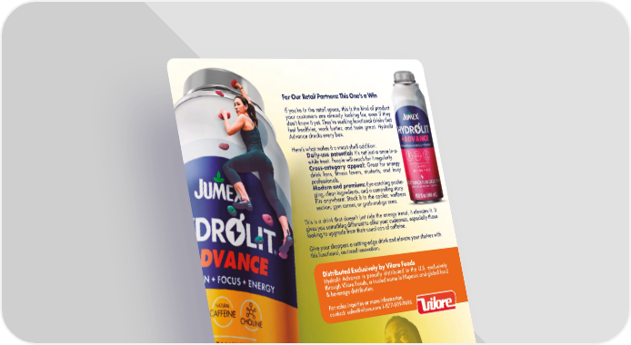 For Our Retail Partners: This One’s a Win If you’re in the retail space, this is the kind of product your customers are already looking for, even if they don’t know it yet. They’re seeking functional drinks that feel healthier, work better, and taste great. Hydrolit Advance checks every box. Here’s what makes it a smart shelf addition: Daily-use potential: It’s not just a once-in-a- while treat. People will reach for it regularly. Cross-category appeal: Great for energy drink fans, fitness lovers, students, and busy professionals. Modern and premium: Eye-catching packa- ging, clean ingredients, and a compelling story. Fits anywhere: Stock it in the cooler, wellness section, gym corner, or grab-and-go area. This is a drink that doesn’t just ride the energy trend, it elevates it. It gives you something different to offer your customers, especially those looking to upgrade from their usual can of caffeine. Give your shoppers a cutting-edge drink and elevate your shelves with this functional, on-trend innovation. Distributed Exclusively by Vilore Foods Hydrolit Advance is proudly distributed in the U.S. exclusively through Vilore Foods, a trusted name in Hispanic and global food & beverage distribution. For sales inquiries or more information, contact: [email protected] 1-877-609-9496 ABASTO.COM JULIO / AGOSTO 2025 35