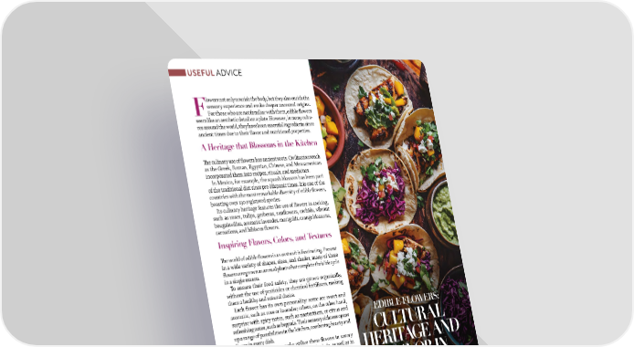 EDIBLE FLOWERS: CULTURAL HERITAGE AND FLAVOR IN THE KITCHEN F lowers not only nourish the body, but they also enrich the sensory experience and evoke deeper ancestral origins. For those who are not familiar with them, edible flowers seem like an aesthetic detail on a plate. However, in many cultu- res around the world, they have been essential ingredients since ancient times due to their flavor and nutritional properties. A Heritage that Blossoms in the Kitchen The culinary use of flowers has ancient roots. Civilizations such as the Greek, Roman, Egyptian, Chinese, and Mesoamerican incorporated them into recipes, rituals, and medicines. In Mexico, for example, the squash blossom has been part of the traditional diet since pre-Hispanic times. It is one of the countries with the most remarkable diversity of edible flowers, boasting over 130 registered species. Its culinary heritage features the use of flowers in cooking, such as roses, tulips, gerberas, sunflowers, orchids, vibrant bougainvillea, aromatic lavender, marigolds, orange blossoms, carnations, and hibiscus flowers. Inspiring Flavors, Colors, and Textures The world of edible flowers is as vast as it is fascinating. Present in a wide variety of shapes, sizes, and shades, many of these flowers are grown as annual plants that complete their life cycle in a single season. To ensure their food safety, they are grown organically, without the use of pesticides or chemical fertilizers, making them a healthy and natural choice. Each flower has its own personality: some are sweet and aromatic, such as rose or lavender; others, on the other hand, surprise with spicy notes, such as nasturtium, or citrus and refreshing notes, such as begonia. Their sensory richness opens up a range of possibilities in the kitchen, combining beauty and flavor in every dish. In Mexican cuisine, cooks utilize these flowers in savory dishes, such as sauces, soups, stews, and salads, as well as in sweet recipes, pastries, and infusions. Traditional Mexican Dishes Featuring These Ingredients: Zucchini flower fritters, orange blossom jam, guayaizote, Palumbo atole, cempasúchil flower cream, colorín flower tacos, and poinsettia flower mousse; watercress salad, tezontle cakes, hibiscus tea, as well as chamomile or rosemary infusions, and innovative dishes with rose, pansy, or geranium. By Ana María Triana, Founder of AnaBella Dried Food, Human and Organizational Development Consultant – Evoluteca Consulting & Advisors Growing consumer interest in the aesthetics of culinary presen- tation, the use of pure, organic, and distinctive ingredients, as well as a shift toward plant-based and vegan diets, has become one of the main drivers of the edible flower market. In the United States, the edible flower market has experienced significant expansion, reaching $1.2 billion in 2024, with projections of $3 billion by 2035. Demand from the food and beverage, baked goods, dairy, and confectionery sectors has driven this increase. In an increasingly industrialized world, edible flowers whis- per to us that food can be art, memory, and a reconnection with nature. By incorporating them into our meals, we not only add color to what nourishes us, but we also build a bridge between the ancestral and the contemporary, honoring the earth and our valuable cultural heritage. A Growing Industry USEFUL ADVICE 94 JULY / AUGUST 2025 ABASTO.COM