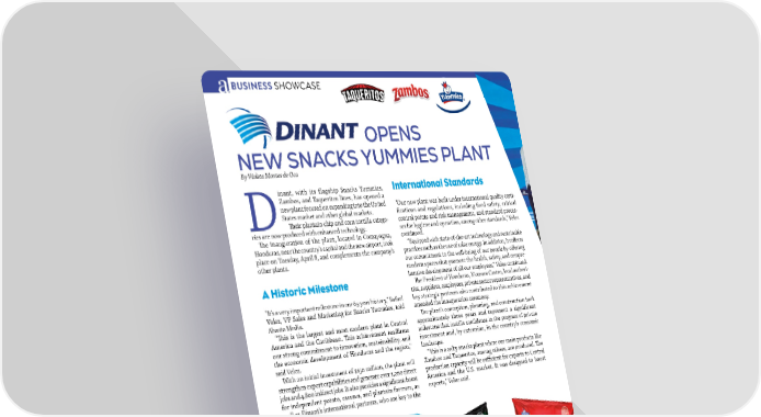 BUSINESS SHOWCASE 86 JULIO / AGOSTO 2025 ABASTO.COM [email protected] www.mega-foods.com USA: 972 482 7708 @labotaneraUS D inant, with its flagship Snacks Yummies, Zambos, and Taqueritos lines, has opened a new plant focused on expanding into the United States market and other global markets. Their plantain chip and corn tortilla catego- ries are now produced with enhanced technology. The inauguration of the plant, located in Comayagua, Honduras, near the country's capital and the new airport, took place on Tuesday, April 8, and complements the company's other plants. A Historic Milestone "It's a very important milestone in our 65-year history," Rafael Velez, VP Sales and Marketing for Snacks Yummies, told Abasto Media. "This is the largest and most modern plant in Central America and the Caribbean. This achievement reaffirms our strong commitment to innovation, sustainability, and the economic development of Honduras and the region," said Velez. With an initial investment of $150 million, the plant will strengthen export capabilities and generate over 1,200 direct jobs and 4,800 indirect jobs. It also provides a significant boost for independent potato, cassava, and plantain farmers, as well as Dinant's international partners, who are key to the value chain. International Standards "Our new plant was built under international quality certi- fications and regulations, including food safety, critical control points and risk management, and standard proces- ses for hygiene and operation, among other standards," Velez continued. “Equipped with state-of-the-art technology and sustainable practices such as the use of solar energy. In addition, it reflects our commitment to the well-being of our people by offering modern spaces that promote the health, safety, and compre- hensive development of all our employees,” Velez continued. The President of Honduras, Xiomara Castro, local authori- ties, suppliers, employees, private sector representatives, and key strategic partners who contributed to this achievement attended the inauguration ceremony. The plant's conception, planning, and construction took approximately three years and represent a significant milestone that instills confidence in the progress of private investment and, by extension, in the country's economic landscape. "This is a salty snacks plant where our main products like Zambos and Taqueritos, among others, are produced. The production capacity will be sufficient for exports to Central America and the U.S. market. It was designed to boost exports," Velez said. Key Facts: • Largest and most modern plant in Central America • Location: Comayagua, Honduras • Investment: $150 million • Direct Jobs: +1,200 • Indirect Jobs: +4,800 By Violeta Montes de Oca NEW SNACKS YUMMIES PLANT NEW SNACKS YUMMIES PLANT OPENS OPENS
