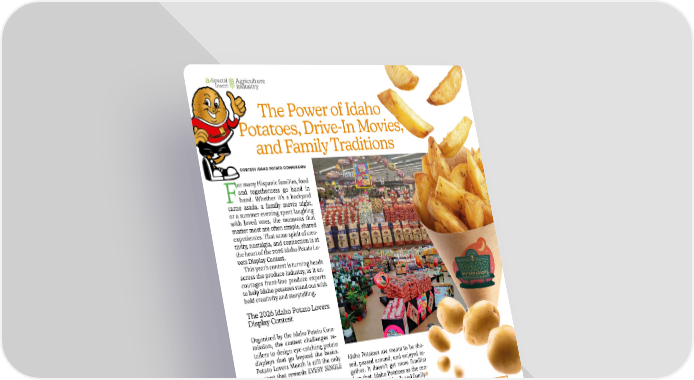 4 • March | April 2026 • abasto.com CORTESY IDAHO POTATO COMMISSION F or many Hispanic families, food and togetherness go hand in hand. Whether it’s a backyard carne asada, a family movie night, or a summer evening spent laughing with loved ones, the moments that matter most are often simple, shared experiences. That same spirit of crea- tivity, nostalgia, and connection is at the heart of the 2026 Idaho Potato Lo- vers Display Contest. This year’s contest is turning heads across the produce industry, as it en- courages front-line produce experts to help Idaho potatoes stand out with bold creativity and storytelling. The 2026 Idaho Potato Lovers Display Contest Organized by the Idaho Potato Com- mission, the contest challenges re- tailers to design eye-catching potato displays that go beyond the basics. Potato Lovers Month is still the only contest that rewards EVERY SINGLE entry. With more than $150,000 in cash and prizes available, the competition rewards imagination, engagement, and emotional connection. That’s where the idea of drive-in movies fits perfectly. Drive-in theaters are deeply roo- ted in American culture, especially among families who value afforda- ble entertainment, shared food, and memorable nights under the stars. For many, drive-ins evoke memories of piling into the car, bringing home- made snacks, and enjoying a movie together. Idaho potatoes naturally belong in that experience. Just as popcorn became a movie-ni- ght staple, Idaho potatoes can easily take center stage. Think crispy oven- baked potato wedges seasoned with chili and lime, loaded baked potato- es topped with cheese and crema, or homemade fries served family-style. The Power of Idaho Potatoes, Drive-In Movies, and Family Traditions Idaho Potatoes are meant to be sha- red, passed around, and enjoyed to- gether. It doesn’t get more familiar than that, Idaho Potatoes as the cen- tral dish to unite friends and family. For Hispanic consumers especia- lly, Idaho potatoes represent ver- satility, value, and tradition. They fit seamlessly into familiar recipes while offering endless new possibi- lities. Pairing them with a drive-in movie themed POS highlights their role not just as an ingredient, but as part of meaningful family moments. Retail displays inspired by drive-in themes tap into that same nostal- gia. A creative potato display that reminds shoppers of movie nights, classic films, or family gatherings doesn’t just sell Idaho potatoes, it evokes a memory or generates the start to a new family tradition. How do you create that emotional con- nection telling a story, with a display, that will drive customers to grab a bag and take it home? Great displays don’t just sell po- tatoes, they create moments. Mo- ments that remind shoppers of fami- ly, tradition, and time spent together. Your Point-of-Sale kit is the first step in bringing that story to your produ- ce department. Order yours today, www.idahopotato.com/forms/3 start planning your display, and grab your share of more than $150,000 in cash and prizes while celebrating the tradition of Idaho potatoes. Hispanic Consumer’s Displays Special Insert Agriculture industry
