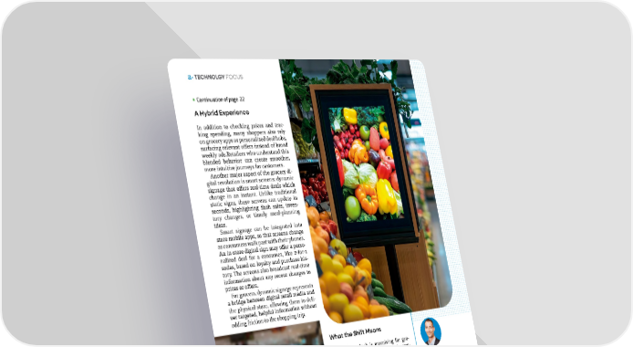 24 • March | April 2026 • abasto.com A Hybrid Experience In addition to checking prices and trac- king spending, many shoppers also rely on grocery apps as personalized deal hubs, surfacing relevant offers instead of broad weekly ads.Retailers who understand this blended behavior can create smoother, more intuitive journeys for customers. Another major aspect of the grocery di- gital revolution is smart screens: dynamic signage that offers real-time deals which change in an instant. Unlike traditional static signs, these screens can update in seconds, highlighting flash sales, inven- tory changes, or timely meal-planning ideas. Smart signage can be integrated into store mobile apps, so that screens change as consumers walk past with their phones. An in-store digital sign may offer a perso- nalized deal for a consumer, like 2-for-1 sodas, based on loyalty and purchase his- tory. The screens also broadcast real-time information about any recent changes to prices or offers. For grocers, dynamic signage represents a bridge between digital retail media and the physical store, allowing them to deli- ver targeted, helpful information without adding friction to the shopping trip. Christian Armstrong VP of Product Management at Spectrio. With 16 years of experience in the digital signage industry, Christian Armstrong has gained a wealth of knowledge and expertise in his field. As one of the founding members of Industry Weapon, a CMS provider, Christian played a significant role in the company’s growth and success. What the Shift Means While the outlook is promising for gro- cers, staying competitive will require con- tinuous adaptation. Mobile-savvy shoppers don’t just want lower prices – they expect the same level of personalization, speed, and convenien- ce they experience online. Digital signage can help meet those ex- pectations by surfacing timely deals, hi- ghlighting items that pair well together, or adjusting messages based on inventory changes. Used thoughtfully, these screens can guide people through the store more effi- ciently and reinforce the offers they alre- ady see in their apps. That makes the real challenge one of ba- lance. Grocers need to deploy technology in ways that enhance the trip rather than distract from it, weaving these tools into the natural flow of how people already shop. • Continuation of page 22 • TECHNOLGY FOCUS