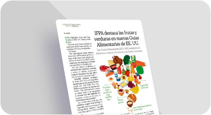 16 • March | April 2026 • abasto.com IFPA destaca las frutas y verduras en nuevas Guías Alimentarias de EE. UU. BY ABASTO I FPA Highlights Fruits and Vege- tables in New U.S. Dietary Guide- lines The 2025–2030 Dietary Guidelines emphasize whole foods and the con- sumption of fruits and vegetables. By Abasto The International Fresh Produce Association (IFPA) welcomed the re- lease of the 2025–2030 Dietary Gui- delines for Americans (DGA), which underscore the importance of fruits and vegetables in a healthy diet. The new Dietary Guidelines re- commend that Americans consume a variety of colorful, nutrient-rich products throughout the day, with a diet focused on “real whole foods.” “Scientific evidence consistent- ly shows that fruits and vegetables should make up the majority of what people eat,” said Mollie Van Lieu, IFPA’s vice president of nutrition and health. “The Administration’s focus on whole foods is an opportunity to increase fruit and vegetable con- sumption, as they are the most nu- trient-dense foods available.” For a 2,000-calorie daily plan, the guidelines suggest three servings of vegetables and two servings of fruit, distinguishing between naturally occurring sugars in fruits and added sugars. IFPA also appreciated the guideli- nes’ focus on reducing added sugars and highly processed foods, which often replace healthier options such as fruits and vegetables. Today’s Dietary Guidelines reinforce the critical role that fruits and vegetables play in overall health.” -Mollie Van Lieu IFPA Vice President of Nutrition and Health. Impact on Federal Nutrition Programs Van Lieu noted that the Dietary Gui- delines are a framework for nume- rous federal nutrition programs. IFPA is committed to continuing to work to ensure that a wide variety Las Guías Alimentarias 2025–2030 enfatizan los alimentos enteros y el consumo de frutas y verduras of fruits and vegetables are availa- ble in these programs and that the 2025–2030 Guidelines drive signifi- cant increases in fruit and vegetable consumption for all consumers. The Dietary Guidelines influen- ce key federal programs, including school breakfasts and lunches, the WIC food package, military food pro- grams, and other nutrition initiati- ves. IFPA’s Involvement in the Develop- ment of the Guidelines IFPA was actively involved in the development of the guidelines, sub- mitting written comments, provi- ding oral testimony, and nominating members to the Dietary Guidelines Advisory Committee. The association continues to advo- cate for access to fruits and vegeta- bles in federal nutrition programs. 2025–2030 Dietary Guidelines for Americans Published by the U.S. Depart- ment of Health and Human Ser- vices and the U.S. Department of Agriculture. Emphasize “whole real foods” as the basis of healthy eating. Recommend three servings of ve- getables and two servings of fruit per day for a 2,000-calorie diet. They distinguish between natu- rally occurring sugars in fruits and added sugars. They encourage reducing highly processed foods and added sugars. They guide federal nutrition pro- grams, including school menus, WIC, and military food services. Vegetables and fruits Whole grains Proteins, dairy products, and healthy fats Special Insert Agriculture industry