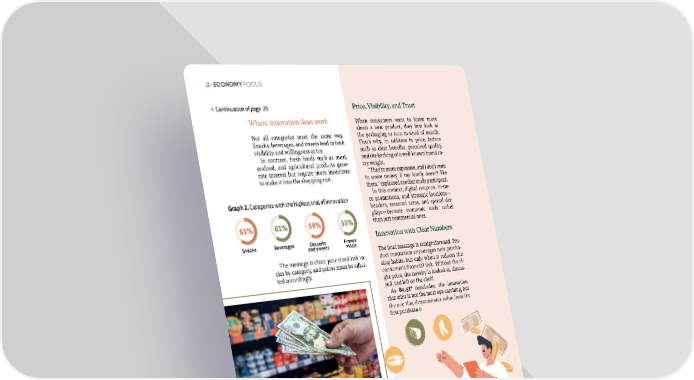 • ECONOMY FOCUS Coupons. 2 Free samples. 3 Discounts. Where innovation does work Not all categories react the same way. Snacks, beverages, and sweets lead in both visibility and willingness to try. In contrast, fresh foods such as meat, seafood, and agricultural products gene- rate interest but require more incentives to make it into the shopping cart. The message is clear: perc eived risk va- ries by category, and prices must be adjus- ted accordingly. Snacks Beverages Desserts and sweets Frozen meals 61% 61% 59% 55% Graph 2. Categories with the highest trial of innovation Innovators Are Worth More Price, Visibility, and Trust When consumers want to know more about a new product, they first look at the packaging or turn to word of mouth. That’s why, in addition to price, factors such as clear benefits, perceived quality, and the backing of a well-known brand ca- rry weight. “They’re more expensive, and I don’t want to waste money if my family doesn’t like them,” explained another study participant. In this context, digital coupons, in-sto- re promotions, and strategic locations— headers, seasonal areas, and special dis- plays—become economic tools rather than just commercial ones. Innovation with Clear Numbers The final message is straightforward. Pro- duct innovation encourages new purcha- sing habits, but only when it reduces the consumer’s financial risk. Without the ri- ght price, the novelty is looked at, discus- sed, and left on the shelf. As 84.51° concludes, the innovation that wins is not the most eye-catching, but the one that demonstrates value from the first purchase. 28 • March | April 2026 • abasto.com Main factors that encourage people to buy new products at the supermarket. 1 Households that buy innovations not only try more. They spend more and visit the store more often. According to transactional data from 84.51°: • They buy 12 units per trip, compared to 4 for those who do not try innovation. • They spend $49 per visit, compared to $15. • They visit the store 14 times per quarter, compa- red to 4 visits per quarter. • Well-executed innovation does not cannibalize sa- les: it increases customer value. • Continuation of page 26