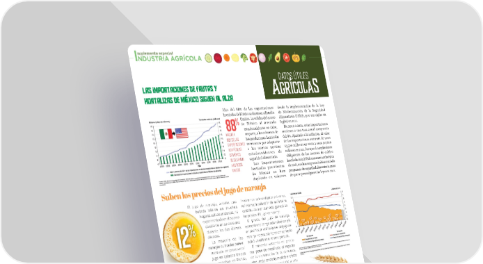 suplemento especial INDUSTRIA AGRÍCOLA Datos Útiles Las importaciones de frutas y Agrícolas hortalizas de MÉxico siguen al alza Más del 88% de las exportaciones desde la implementación de la Ley hortícolas de México se destinan a Estados de Modernización de la Seguridad %Unidos. La solidez del acceso Alimentaria (FSMA, por sus siglas en de México al mercado inglés) en 2011. 88 estadounidense se debe, De 2000 a 2021, estas importaciones Más del en parte, a los esfuerzos de crecieron a una tasa anual compuesta 88% de las los productores hortícolas del 8%. Ajustado a la in昀氀ación, el valor exportaciones mexicanos por adaptarse de las importaciones aumentó de unos hortícolas a las nuevas normas $3,500 millones en 2000 a unos $17,600 de México estadounidenses de millones en 2021. Aunque el cumplimiento se destinan seguridad alimentaria. obligatorio de las normas de cultivo a Estados Las importaciones hortícola de la FSMA comenzó a principios Unidos. hortícolas procedentes de 2018, muchas empresas habían iniciado de México se han programas de seguridad alimentaria antes duplicado en volumen de que se promulgaran las leyes en 2011. Suben los precios del jugo de naranja El jugo de naranja, antaño una fenómenos meteorológicos extremos. bebida básica en muchos Así mismo, la reducción de la oferta ha hogares estadounidenses, ha contribuido a un aumento general de experimentado un descenso los precios del jugo de naranja. constante en su consumo El precio del jugo de naranja % durante las dos últimas concentrado congelado subió un 5% décadas. en 20 años, mientras que el del jugo de 12 La mayoría de las naranja no procedente de concentrado naranjas cultivadas para el subió un 12% en el mismo periodo. mercado de procesado/ El modesto aumento del precio jugo en Estados Unidos real pone de mani昀椀esto el impacto El precio del jugo de se cosechan en Florida, de la disminución de la demanda, naranja no concentrado pero en los últimos años atenuando en cierta medida el efecto congelado subió un 12% se ha visto afectada sobre los precios asociado a una en 20 años por enfermedades y menor oferta. Crecen las importaciones de trigo Se prevé que las importaciones de trigo alcancen impulsadas por el trigo duro rojo de primavera y el su nivel más alto en seis años para la campaña trigo duro del vecino Canadá. Mientras que las comercial 2023/24 (julio-junio). Los años consecutivos importaciones estadounidenses de trigo duro de sequía en las principales regiones productoras rojo de invierno son elevadas en 2023/24, estadounidenses de trigo duro rojo de invierno, un las importaciones de trigo ingrediente utilizado para hacer pan, 昀椀deos asiáticos blando rojo de invierno y y harina, han reducido la producción estadounidense, blanco están relativamente elevando los precios internos. cerca de los niveles normales. Los molineros han buscado fuentes menos costosas, En relación con la incluido el trigo a precios competitivos de la Unión escasez de suministros Europea (UE). Las importaciones estadounidenses de de este trigo rojo duro de trigo duro rojo de invierno, principalmente de la UE, invierno en 2023/24, se para 2023/24 se sitúan en 25 millones de fanegas, una prevé que las exportaciones cifra récord, y un aumento de 5 millones de fanegas estadounidenses de esta respecto a 2022/23. clase de trigo alcancen Este 昀氀ujo comercial es atípico. Las importaciones su nivel más bajo jamás estadounidenses de trigo están normalmente registrado. 88 MMAARRZZOO//AABBRRIIL 20L 20224 - 4 - AABABASSTTOO..CCOMOM