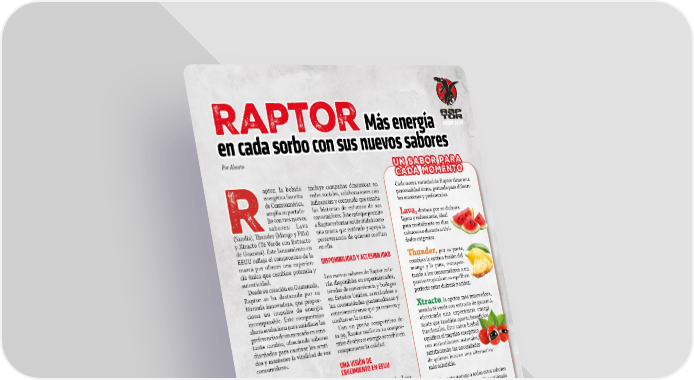 Abasto Magazine: Marzo/ Abril 2025 SPANISH Page 13 Page 15Raptor, más energía en cada sorbo con sus nuevos sabores. Descubra los nuevos sabores de la bebida energética Raptor: Lava, Thunder y Xtracto.