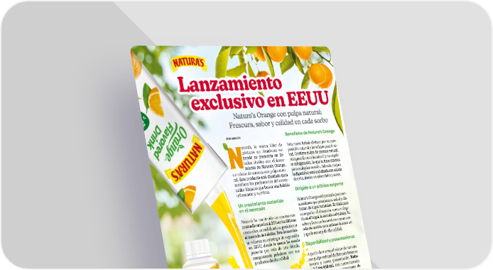 POR ABASTO atura’s, la marca líder de néctares en Honduras ex- pande su presencia en Es- tados Unidos con el lanza- miento de Natura’s Orange, un néctar de naranja con pulpa natu- ral. Este producto está diseñado para satisfacer las preferencias del consu- midor hispano que busca una bebida refrescante y nutritiva. Un crecimiento sostenido en el mercado Natura’s ha mantenido un crecimiento promedio superior al 20% en los últimos cinco años, consolidando su posición en el mercado de bebidas. Este lanzamien- to refuerza su estrategia de expansión en EEUU, donde la marca ha estado presente por más de una década, conquistando paladares con sus productos de alta calidad. Lanzamiento Lanzamiento exclusivo en EEUU exclusivo en EEUU Natura’s Orange con pulpa natural: Frescura, sabor y calidad en cada sorbo Beneficios de Natura’s Orange Esta nueva bebida destaca por su com- posición natural y beneficios para la sa- lud. Contiene pulpa de naranja natural, enriquecida con vitamina C y no requie- re refrigeración, lo que la hace práctica para cualquier ocasión. Además, mejora la digestión y está endulzada con azúcar de caña, dando un sabor dulce y suave. Dirigido a un público exigente Natura’s Orange está pensado para con- sumidores que priorizan su salud y dis- frutan de jugos naturales. Es ideal para acompañar el desayuno, como refrige- rio en el hogar, la escuela o el trabajo. Su sabor y frescura lo convierten en una ex- celente opción para quienes buscan un jugo de naranja de alta calidad. Disponibilidad y presentaciones A partir de marzo, el néctar de naranja con pulpa natural de Natura’s lanza su tercera y nueva presentación Natu- ra’s Lata 450 mL. Este nuevo tamaño complementa las presentaciones de 1,000 mL y 500 mL en envase T-Top, ampliando el alcance de Natura’s Pul- pa con la sólida red de distribución en mercados hispanos y centroamerica- nos de Estados Unidos. Una apuesta segura para distribuidores y supermercados El mercado de jugos de naranja sigue creciendo en EEUU., al igual que la po- blación hispana. Natura’s, una marca nostálgica con fuerte conexión con este público garantiza una alta rotación en los puntos de venta. Gracias a su fór- mula ganadora y su sabor inigualable, Natura’s Orange se proyecta como una excelente adición al portafolio de jugos de naranja en el país. 10 • Marzo | Abril 2026 • abasto.com