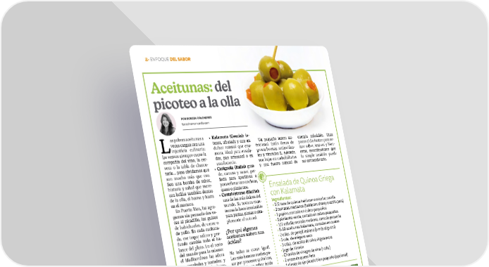 88 • Marzo | Abril 2026 • abasto.com • ENFOQUE DEL SABOR Aceitunas: del picoteo a la olla L as pobres aceitunas a veces cargan con una injusticia culinaria: las vemos siempre como la compañía del vino, la cer- veza o la tabla de charcu- terie... pero olvidamos que son mucho más que eso. Son una bomba de sabor, historia y salud que mere- cen brillar también dentro de la olla, el horno y hasta en el mortero. En Puerto Rico, las agre- gamos sin pensarlo dos ve- ces al picadillo, los guisos de habichuelas, de carne o de pollo. En cada cuchara- da, ese toque salino y pro- fundo cambia todo el ba- lance del plato. En el resto del mundo pasa lo mismo: el Mediterráneo las adora en ensaladas y tostadas; y países como Perú las incor- poran en cremas, tapena- des y pastas, especialmente las negras, como parte de su deliciosa fusión con la cocina española e italiana. Verdes o negras, no todas saben igual Una buena calidad de acei- tuna verde o negra no solo se diferencian por el color. Unas aportan frescura, amargor, dulzor y unas son más carnosas que otras, perfectas para ensaladas, pastas, o simplemente so- bre una tostada con un chorrito de aceite de oliva virgen extra. Entre las más comunes (de buena cali- dad) encuentras la: • Kalamata (Grecia): in- tensa, afrutada y con un dulzor natural que ena- mora. Ideal para ensala- das, pan artesanal o en una focaccia. • Cerignola (Italia): gran- de, carnosa y suave, per- fecta para aperitivos o para rellenar con anchoas, queso o pimientos. • Castelvetrano (Sicilia): una de las más dulces del mundo. Su textura man- tecosa la hace irresistible para pastas, pizzas o sim- plemente al natural. ¿Por qué algunas aceitunas saben tan ácidas? No todas se curan igual. Las más baratas suelen pa- sar por procesos químicos, lo que deja un sabor ácido y plano. En cambio, las de buena calidad se curan len- tamente en salmuera natu- ral, desarrollando matices dulces, frutales y una tex- tura más carnosa. Por eso, elige las que sepan a fruto, no a vinagre. Usos que te van a inspirar Agrégalas en guisos, em- panadas, pastas y en todo tipo de ensaladas. Pero no olvides que si las mueles en un mortero, hasta lo- grar un paté, triunfarán en una tostada. Y por supues- to, en arroces y pescados al horno, son geniales. POR DOREEN COLONDRES lacocinanomuerde.com Ingredientes: • 1/2 taza de quinoa heirloom o tricolor, cocida • 2 tomates medianos (heirloom cherry o estilo pera) • 1 pepino, cortado en cubos pequeños • 1 pimiento verde, cortado en cubos pequeños • 1/2 cebolla morada mediana, cortada pequeña • 8-10 aceitunas Kalamata, cortadas en cuatro • 2 cdas. de perejil italiano (o más al gusto) • 1 cda. de orégano seco • 3 cdas. de aceite de oliva virgen extra • Jugo de 1 limón • Chorrito de vinagre de vino (1 cda.) • 2 onzas de queso Feta • 1 diente de ajo picado bien pequeño (opcional) Ensalada de Quinoa Griega con Kalamata Un pequeño tesoro nu- tricional. Están llenas de grasas buenas, antioxidan- tes y vitamina E. Además, son bajas en carbohidratos y una fuente natural de energía saludable. Unas pocas al día bastan para su- mar sabor, textura y bien- estar, recordándonos que lo simple también puede ser extraordinario. Lo que tienes que hacer: Pica y mezcla todos los in- gredientes, combinando suavemente con la quinoa al final. Agrega el aceite, el jugo de limón, el vinagre, la sal, pimienta, mezcle y sirve o refrigera para que la disfrutes fría y los sabo- res se unan más. Doreen Colondres es autora, chef, portavoz de cocina y vinos, creadora de lacocinanomuerde. com y fundadora de vitishouse.com. Síguela en @doreencolondres