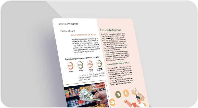 •ENFOQUE ECONÓMICO Cupones 2 Muestras gratuitas 3 Descuentos • Continua de la pág. 26 Dónde la innovación sí funciona No todas las categorías reaccionan igual. Snacks, bebidas y dulces lideran tanto en visibilidad como en disposición a probar. En contraste, los alimentos frescos, como la carne, mariscos y productos agrí- colas, generan interés, pero requieren más incentivos para llegar al carrito. La lectura es clara: el riesgo percibido varía por categoría, y el precio debe ajus- tarse a ese riesgo. Snacks Bebidas Postres y dulces Comidas congeladas 61% 61% 59% 55% Gráfico 2. Categorías con mayor prueba de innovación Innovadores valen más Precio, visibilidad y confianza Cuando los consumidores quieren saber más sobre un producto nuevo, miran pri- mero el empaque o recurren al boca a boca. Por eso, además del precio, pesan fac- tores como beneficios claros, calidad perci- bida y respaldo de una marca conocida. “Son más caros y no quiero desperdiciar dinero si a mi familia no le gusta”, explicó otro participante del estudio. En ese contexto, cupones digitales, promo- ciones en tienda y ubicaciones estratégicas —cabeceras, zonas estacionales y displays especiales— se convierten en herramientas económicas, no solo comerciales. Innovación con números claros El mensaje final es directo. La innovación de productos sí fomenta nuevos hábitos de compra, pero solo cuando reduce el riesgo financiero del consumidor. Sin un precio adecuado, la novedad se mira, se comenta y se deja en el anaquel. Como concluye 84.51°, la innovación que gana no es la más llamativa, sino la que de- muestra valor desde el primer ticket. 28 • Marzo | Abril 2026 • abasto.com Factores principales que animan a comprar nuevos productos en el supermercado 1 Los hogares que sí compran innovación no solo prueban más. Gastan más y visitan más la tienda. Según datos transaccionales de 84.51°: • Compran 12 unidades por viaje, frente a 4 de quienes no prueban innovación. • Gastan $49 por visita, contra 15. • Visitan la tienda 14 veces por trimestre, frente a 4. • La innovación bien ejecutada no canibaliza ventas: amplía el valor del cliente.