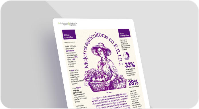 10 • Marzo | Abril 2026 • abasto.com Las mujeres agricultoras tienden a ser ligeramente más jóvenes que los hombres. 33% son agricultoras principiantes (10 años o menos de experiencia) frente a 28% entre los hombres . Son menos propensas a considerar la agricultura como su ocupación principal, lo que refleja la persistencia de ingresos mixtos o trabajo externo. Muj e r e s a g r i c u l t o r a s e n E . E . U.U. POR ABASTO Las mujeres ya no son una excepción en la agricultura estadounidense : están presentes en más de la mitad de las granjas y controlan una parte sustancial de la producción. Por su parte, las agricultoras hispanas siguen siendo un grupo pequeño en términos relativos, pero con peso económico creciente, especialmente en estados agrícolas clave La participación femenina en la agricultura ha crecido de forma constante en las últimas décadas, tanto por cambios metodológicos del censo como por una mayor presencia real en la toma de decisiones. (Censo de Agricultura 2022): En EE. UU. había alrededor de 1.2 millones de productoras agrícolas, lo que representa 36% de los 3.37 millones de productores del país. El 36% de los productores hispanos son mujeres, una proporción similar a la media nacional. Unas 40,000 mujeres agricultoras hispanas operan o coadministran granjas en Estados Unidos. Las mujeres administraron o coadministraron granjas que abarcan aproximadamente 407 millones de acres. 58% de todas las granjas en EE. UU. tuvo al menos una mujer productora. Estas granjas generaron cerca de $222,000 millones en ventas agrícolas, equivalentes a 41% del total nacional. Tendencia clave Perfil demográfico: Cifras generales Suplemento especial Industria agrícola