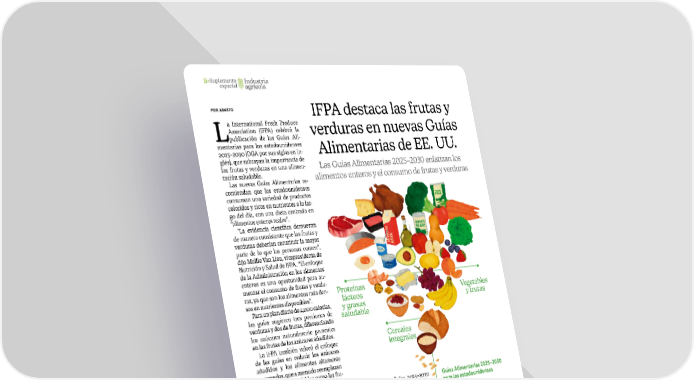 16 • Marzo | Abril 2026 • abasto.com IFPA destaca las frutas y verduras en nuevas Guías Alimentarias de EE. UU. POR ABASTO L a International Fresh Produce Association (IFPA) celebró la publicación de las Guías Ali- mentarias para los estadounidenses 2025–2030 (DGA por sus siglas en in- glés), que subrayan la importancia de las frutas y verduras en una alimen- tación saludable. Las nuevas Guías Alimentarias re- comiendan que los estadounidenses consuman una variedad de productos coloridos y ricos en nutrientes a lo lar- go del día, con una dieta centrada en “alimentos enteros reales”. “La evidencia científica demuestra de manera consistente que las frutas y verduras deberían constituir la mayor parte de lo que las personas comen”, dijo Mollie Van Lieu, vicepresidenta de Nutrición y Salud de IFPA. “El enfoque de la Administración en los alimentos enteros es una oportunidad para au- mentar el consumo de frutas y verdu- ras, ya que son los alimentos más den- sos en nutrientes disponibles”. Para un plan diario de 2,000 calorías, las guías sugieren tres porciones de verduras y dos de frutas, diferenciando los azúcares naturalmente presentes en las frutas de los azúcares añadidos. La IFPA también valoró el enfoque de las guías en reducir los azúcares añadidos y los alimentos altamente procesados, que a menudo reemplazan opciones más saludables como las fru- tas y verduras. Las Guías Alimentarias de hoy refuerzan el papel crítico que tienen las frutas y verduras en la salud general”. Mollie Van Lieu Vicepresidenta de Nutrición y Salud de IFPA. Impacto en programas federales de nutrición Van Lieu destacó que las Guías Ali- mentarias son un marco para nu- merosos programas federales de nu- trición. IFPA está comprometida en seguir trabajando para garantizar que haya una amplia variedad de frutas y verduras disponibles en estos pro- Las Guías Alimentarias 2025–2030 enfatizan los alimentos enteros y el consumo de frutas y verduras gramas y que las Guías 2025–2030 impulsen aumentos significativos en el consumo de frutas y verduras para todos los consumidores. Las Guías Alimentarias influyen en programas federales clave, incluidos los desayunos y almuerzos escolares, el paquete de alimentos del programa WIC, los programas de alimentación militar y otras iniciativas nutricionales. Participación de IFPA en el desarrollo de las guías La IFPA participó activamente en el desa- rrollo de las guías, enviando comentarios escritos, ofreciendo testimonios orales y nominando miembros para el Comité Asesor de las Guías Alimentarias. La asociación continúa promovien- do el acceso a frutas y verduras en los programas federales de nutrición. Cereales integrales Guías Alimentarias 2025–2030 para los estadounidenses Publicadas por el Departamento de Salud y Servicios Humanos y el Departamento de Agricultura de EE. UU. Enfatizan los “alimentos enteros reales” como base de una alimen- tación saludable. Recomiendan tres porciones de verduras y dos porciones de fruta al día para una dieta de 2,000 calorías. Distinguen los azúcares natural- mente presentes en las frutas de los azúcares añadidos. Fomentan la reducción de ali- mentos altamente procesados y azúcares añadidos. Orientan programas federales de nutrición, incluidos los menús esco- lares, WIC y la alimentación militar. Vegetables y frutas Proteínas lácteos y grasas saludable Suplemento especial Industria agrícola