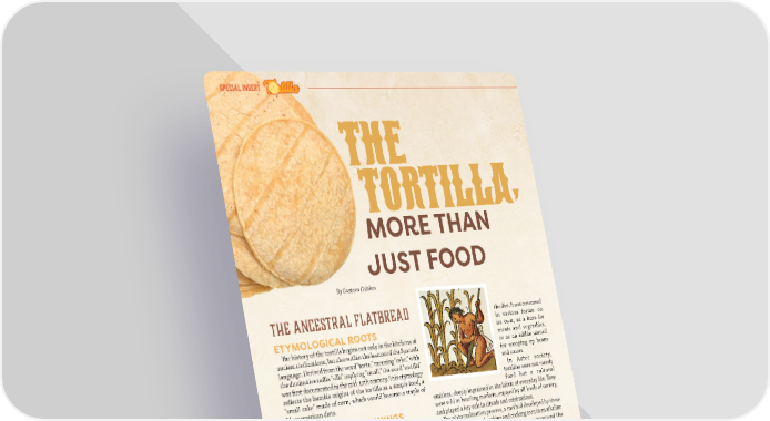special insert MORE THAN JUST FOOD By Gustavo Calabro THE ANCESTRAL FLATBREAD the diet. It was consumed in various forms: on ETYMOLOGICAL ROOTS its own, as a base for 吀栀e history of the tortilla begins not only in the kitchens of meats and vegetables, ancient civilizations, but also within the lexicon of the Spanish or as an edible utensil language. Derived from the word "torta," meaning "cake," with for scooping up beans the diminutive su昀케x "-illa" implying "small," the word "tortilla" and sauces. was 昀椀rst documented in the mid-17th century. 吀栀is etymology In Aztec society, re昀氀ects the humble origins of the tortilla as a simple food, a tortillas were not merely "small cake" made of corn, which would become a staple of food but a cultural Mesoamerican diets. emblem, deeply ingrained in the fabric of everyday life. 吀栀ey were sold in bustling markets, enjoyed by all levels of society, PREHISTORIC BEGINNINGS and played a key role in rituals and celebrations. Long before the Spanish set foot in the New World, the 吀栀e nixtamalization process, a method developed by these peoples of the Sierra Madre Mountains in Mexico had already early peoples, involved soaking and cooking corn in an alkaline perfected the art of making tortillas. Dating back to around solution, typically lime water. 吀栀is process improved the 10,000 B.C., the inception of the tortilla coincides with the nutritional value of corn, making the niacin it contained more domestication of corn. 吀栀is era marks a signi昀椀cant turning readily available for absorption by the body and enhancing the point in human civilization, as communities transitioned from amino acid pro昀椀le of the proteins in corn. It also imparted to the nomadic lifestyles to settled agricultural societies. Corn, with tortilla its distinctive 昀氀avor and texture, which remain largely its high caloric value and adaptability to di昀昀erent terrains, unchanged to this day. became the staple of these societies, laying the groundwork 吀栀e importance of the tortilla extended beyond nutrition; for the development of complex civilizations such as the Aztecs it was a symbol of sustenance and innovation, a testament and the Maya. to the ingenuity of the people who 昀椀rst cultivated corn and transformed it into a food that could sustain large populations. CULINARY As we delve further into the journey of the tortilla through EVOLUTION time, we witness not only the evolution of a food item but A medida que el cultivo de also the unfolding of human history itself. From the ancient mAs corn cultivation became more sophisticated, so too "symbol of sustenance and innovation" did the culinary applications highlands of Mexico to a "symbol of sustenance and innovation" of this versatile grain. The on the global culinary stage, the tortilla embodies the resilience, tortilla, a thin 昀氀atbread made adaptability, and cultural richness of the civilizations that from ground nixtamalized cherished it. corn, emerged as a staple in 1212 MMAAYY//JJUUNNE 20E 20224 - 4 - AABABASSTTOO..CCOMOM