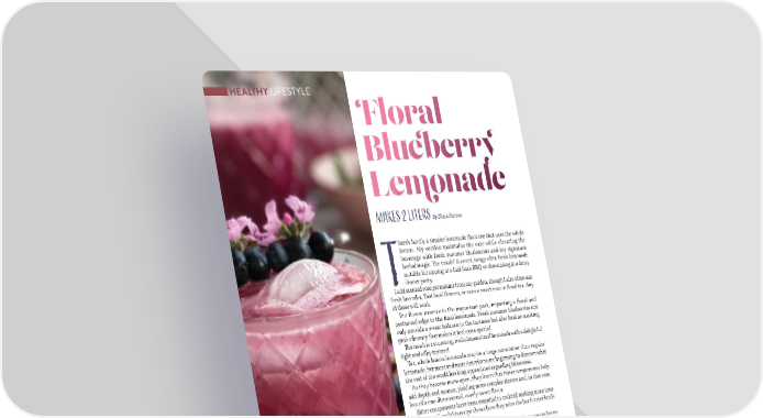 HEALTHY LIFESTYLE Floral Blueberry Lemonade Makes 2 liters By Nissa Pierson here’s hardly a simpler lemonade than one that uses the whole lemon. My version maintains the ease while elevating the beverage with fresh summer blueberries and my signature herbal magic. 吀栀e result? A sweet, tangy ultra-fresh lemonade suitable for sipping at a laid-back BBQ or showcasing at a fancy Tdinner party. I add scented rose geraniums from my garden, though I also often use fresh lavender, 吀栀ai basil 昀氀owers, or even a sweet rose or 昀氀oral tea. Any of these will work. 吀栀e 昀氀ower essence is the important part, imparting a 昀氀oral and perfumed edge to the 昀椀nal lemonade. Fresh summer blueberries not only provide a sweet balance to the tartness but also lend an exciting pink vibrancy that makes it feel extra special. 吀栀e result is a stunning, multidimensional lemonade with a delightful light and silky texture! Yes, whole lemon lemonade may be a tinge more bitter than regular lemonade, but more and more Americans are beginning to discover what the rest of the world has long appreciated regarding bitterness. As they become more open, they learn that bitter components help add depth and nuance, yielding more complex 昀氀avors and, in this case, less of a one-dimensional, overly sweet 昀氀avor. Bitter components have been essential in cocktail making since time immemorial, and this recipe shows how they raise the bar for mocktails as well. *Since we are using the entire lemon, peel and all, I recommend using organic lemons to ensure the skin is free from pesticide and chemical waxy residue. Either way, make sure to wash the lemons well before using. Ingredients Instructions 4 lemons, quartered, seeds removed 1. Blend the lemons, sugar, and water in a 1 cup sugar blender and blend until totally smooth and frothy. 3 cups water for blending 1 cup blueberries 2. Add the blueberries, tea, and fresh 昀氀owers if 1-2 teaspoons of loose 昀氀oral tea using, and process again until all the blueberries are of choice: rose, lavender, jasmine, smooth and creamy. or chamomile (if using a tea bag, remove the tea from the bag, making 3.Strain into a pitcher using a 昀椀ne mesh strainer it loose.) and discard the solids. Fill the pitcher with about 4-5 Handful of fresh geranium 昀氀owers cups of regular or sparkling water. or lavender 昀氀owers (optional) Sparkling water (optional) 4. Serve over ice with a geranium flower or lavender wand garnish. 8080 MMAAYY//JJUUNNE 2E 200224 4 AABBAASSTOTO..CCOOMM