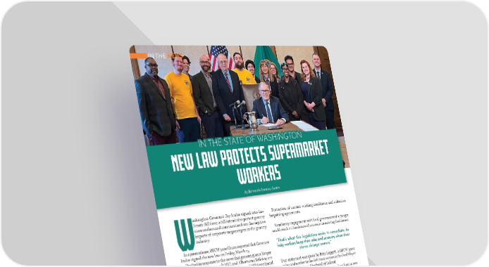 IN THE NEWS ONON TT NNGG HIHI SS AA EE OF OF W W TT AA TT HEHE S S NN T T II ket mar per u otects s w pr New la s ker r wo ez-Santos ernando Ramír By H ashington Governor Jay Inslee signed into law Protection of current working conditions and collective Senate Bill 6007, a bill intended to protect grocery bargaining agreements. store workers and communities from the negative impacts of corporate megamergers in the grocery Mandatory engagement with local government if a merger Windustry. would result in the closure of a store in an existing food desert. In a press release, UFCW 3000 Union reported that Governor “That’s what this legislation seeks to remediate: to Inslee signed the new law on Friday, March 15. help workers keep their jobs and seniority when their Drafted in response to the news that grocery giants Kroger stores change owners.” (owner of Fred Meyer and QFC) and Albertsons/Safeway are planning to merge into one mega-company, ESSB 6007 found 吀栀at statement was given by Britt Leggett, a UFCW 3000 enormous support from local Washington grocery store member and worker in the deli meat section at the Fred Meyer workers and community allies, who advocated throughout in Seattle's Ballard neighborhood of Ballard. the legislative session for its passage. Hundreds of UFCW 3000 supermarket workers from across Washington state sent messages to legislators encouraging “As I explained to legislators, we’ve already learned the hard passage of H.R. 6007, and some traveled to Olympia to meet way through past grocery chain mergers about the upheaval with legislators in person. it causes for workers and shoppers when these chains merge and close or sell o昀昀 neighborhood grocery stores,” said Yasmin “It’s a big sacri昀椀ce for everyday working people to take Ashur, a UFCW 3000 member and checker at the Port Orchard time out of their busy lives to try and engage with the local Albertsons who testi昀椀ed in support of the bill and was on hand political process,” said Joe Mizrahi, Secretary-Treasurer of to see the governor sign it. UFCW 3000. “But being in a union means we can share the load, work together, and make real change that impacts entire THE NEW LAW industries.” The new law requires public notification of new ownership. A period of job protection or rehire for current eligible employees. 2222 MMAAYY//JJUUNNE E 2 200224 4 AABBAASSTTO O..CCOOMM