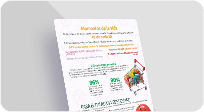 Momentos de la vida El chocolate y los dulces tienen un papel especial durante las celebraciones y 昀椀estas. +8 de cada 10 Estadounidenses celebran San Valentín, Pascua, Halloween y las 昀椀estas de invierno. 64% de las ventas totales de golosinas suceden durante estas fiestas: San Valentín: 4,500 millones de dólares Halloween: $6,400 millones | +5.6% | +10.1% $ Fiestas de invierno: $6,500 millones | Semana Santa: $5,400 millones| +9.4% +4.6% 2-3 veces por semana Es la frecuencia promedio con la que los consumidores disfrutan de golosinas de chocolate o caramelo. Esto se debe a que los productos de con昀椀tería gozan de una permisividad muy alta entre los consumidores, que comprenden el papel de los caprichos en un estilo de vida feliz y equilibrado. 86% 80% Considera que Cree que la salud está bien tener de física y el bienestar vez en cuando un emocional están trozo de chocolate interconectados. o un caramelo. Para el Paladar vegetariano En los últimos años, la creciente concienciación sobre la salud y el bienestar ha provocado un importante aumento de la demanda de productos de con昀椀tería veganos. Los dulces veganos son aquellos que se elaboran sin lácteos, con colores y sabores naturales y autén- tico jugo de frutas. Son ideales para quienes tienen alguna restricción alimentaria o alergia o están preocupadas por su salud. Según el reporte Mercado de la Con昀椀tería Vegana de Future Market Insights Inc., el mercado mundial de la con昀椀tería vegana ha crecido notablemente en los últimos años, impulsado por muchos factores. Uno de los principales es la demanda de productos de con昀椀tería veganos debido a la popularidad que ha ganado el veganismo, especialmente entre la generación Y o milennial y la población económicamente activa. $1,276.3 $1,377.7 millones fue el valor del millones es el valor estimado mercado mundial de del mercado mundial de con昀椀- con昀椀tería vegana en 2023. tería vegana para 2024. 9.2% 27.6% 6.8% es el potencial de es la participación del es lo que se espera crecimiento del mercado mercado que tendrán que crezca el mercado global de confitería las barritas de chocolate de Estados Unidos de vegana de 2024 a 2034. vegano en 2024. 2024 a 2034. AABABASSTTOO..CCOMOM MMAAYYOO//JJUNUNIIOO 2 2002244 3131