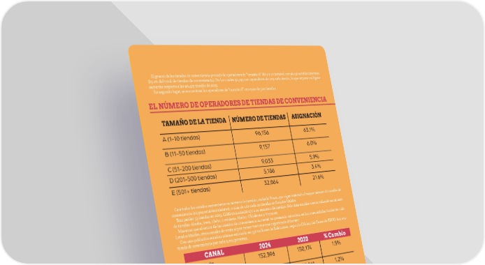 El grueso de las tiendas de conveniencia procede de operadores de “tamaño A” (de 1 a 10 tiendas) con 96,156 establecimientos (63.1% del total de tiendas de conveniencia). De los cuales 91,799 son operadores de una sola tienda, lo que supone un ligero aumento respecto a las 90,423 tiendas de 2023. En segundo lugar, se encuentran los operadores de “tamaño E” con más de 500 tiendas. EL NÚMERO DE OPERADORES DE TIENDAS DE CONVENIENCIA TAMAÑO DE LA TIENDA NÚMERO DE TIENDAS ASIGNACIÓN A (1-10 tiendas) 96,156 63.1% B (11-50 tiendas) 9,157 6.0% C (51-200 tiendas) 9,033 5.9% D (201-500 tiendas) 5,186 3.4% E (501+ tiendas) 32,864 21.6% Casi todos los estados aumentaron su número de tiendas, incluido Texas, que sigue teniendo el mayor número de tiendas de conveniencia (16,304 establecimientos), o más de 1 de cada 10 tiendas en Estados Unidos. Tras perder 53 tiendas en 2023, California añadió 177 a su recuento de tiendas. Sólo siete estados vieron reducido su número de tiendas: Alaska, Iowa, Idaho, Louisiana, Maine, Oklahoma y Vermont. Mientras que el sector de las tiendas de conveniencia aumentó su presencia minorista en las comunidades locales de todo Estados Unidos, otros canales de venta al por menor tuvieron una experiencia diferente: Con una población estadounidense estimada en 336 millones de habitantes, según la O昀椀cina del Censo de EEUU, hay una tienda de conveniencia por cada 2,204 personas. CANAL 2024 2023 % Cambio Tiendas de 152,396 150,174 1.5% conveniencia Tiendas que venden 118,678 120,061 1.2% combustibles Quioscos de venta de 13,065 13,346 -2.2% combustibles Supermercados 45,047 45,380 -0.7% Farmacias 39,752 40,008 -0.6% Tiendas del Dólar 38,435 37,067 3.7% El recuento de tiendas de conveniencia de la industria NACS/NIQ para 2024 se basa en las tiendas en funcionamiento al 31 de diciembre de 2023. AABBAASSTOTO..CCOOMM MMAAYYOO/J/JUUNNIIOO 2 2002244 5151
