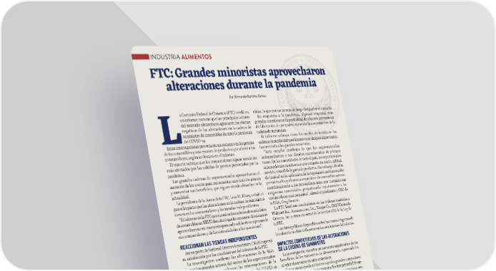 INDUSTRIA ALIMENTOS FTC: Grandes minoristas aprovecharon alteraciones durante la pandemia Por Hernando Ramírez-Santos a Comisión Federal de Comercio (FTC) reveló en e昀椀caz, lo que creó un terreno de juego desigual en el mercado. un informe reciente que los principales actores En respuesta a la pandemia, algunas empresas más del mercado alimentario agravaron los efectos grandes consideraron la posibilidad de adquirir proveedores negativos de las alteraciones en la cadena de de fabricación, lo que podría aumentar la concentración de la suministro de comestibles durante la pandemia cadena de suministro. Ldel COVID-19. El informe subraya cómo los cuellos de botella en las Estas interrupciones provocaron un aumento en los precios cadenas de suministro pueden provocar choques importantes, de los comestibles y una escasez de productos que afectó a los favoreciendo a los grandes minoristas. consumidores, según se destaca en el informe. “Este estudio confirma lo que los supermercados El reporte subraya que los consumidores siguen siendo los independientes y sus clientes experimentan de primera más afectados por las subidas de precios provocadas por la mano. En las comunidades de todo el país, los supermercados pandemia. independientes se esfuerzan por competir en precio, calidad, Las grandes cadenas de supermercados aprovecharon el servicio, comodidad y gama de productos. Sin embargo, décadas aumento de los costos para incrementar aún más los precios de laxitud en la aplicación de la legislación antimonopolio y aumentar sus bene昀椀cios, que siguen siendo elevados en la permiten a los poderosos compradores de comestibles apretar actualidad. coercitivamente a los proveedores para que cumplan sus La presidenta de la Junta de la FTC, Lina M. Khan, señaló el exigencias comerciales, perjudicando injustamente a los grave impacto que las alteraciones en la cadena de suministro competidores más pequeños”, a昀椀rmó el presidente y CEO de tienen en los consumidores y las tiendas independientes. la NGA, Greg Ferrara. “El informe de la FTC que examina las cadenas de suministro La FTC basó sus conclusiones en las órdenes emitidas a de comestibles en EEUU descubrió que las empresas dominantes Walmart Inc., Amazon.com, Inc., Kroger Co., C&S Wholesale aprovecharon este momento para salir adelante a expensas de Grocers, Inc. y otros en virtud de la Sección 6(b) de la Ley de sus competidores y de las comunidades a las que sirven”. la FTC. Los datos públicos disponibles sobre los costos e ingresos de REACCIONAN LAS TIENDAS INDEPENDIENTES la industria también in昀氀uyeron en las conclusiones del informe. Por su parte, la National Grocers Association (NGA) expresó su satisfacción por las conclusiones del informe de la FTC. IMPACTOS COMPETITIVOS DE LAS ALTERACIONES La investigación con昀椀rmó las a昀椀rmaciones de la NGA DE LA CADENA DE SUMINISTRO de que los grandes actores del sector de los supermercados La investigación muestra un aumento signi昀椀cativo de los estadounidenses aprovecharon las interrupciones de la bene昀椀cios de los minoristas de alimentación, superando los cadena de suministro durante la pandemia del COVID-19 niveles observados en años anteriores. para cimentar su dominio en el mercado de comestibles de una Este aumento puede atribuirse a que los grandes compradores forma que agravó la escasez para los consumidores e in昀氀ó los presionan a los proveedores para que les den prioridad frente precios de los comestibles. a los competidores más pequeños, lo que les proporciona una Según el informe de la FTC, no todos los minoristas, ventaja competitiva. mayoristas o productores se vieron afectados por igual por las Como resultado, la disponibilidad de productos y la atracción alteraciones en la cadena de suministro. de clientes se han visto afectadas de forma signi昀椀cativa. Los minoristas de comestibles más pequeños se enfrentaron En medio de la pandemia, la excesiva consolidación en a más problemas de disponibilidad de productos que las grandes el sector minorista plantea riesgos para las cadenas de cadenas de supermercados durante las interrupciones de la suministro. Para contrarrestarlo, algunas empresas han optado cadena de suministro. por diversi昀椀car su base de proveedores o incluso plantearse Algunos supermercados más grandes consiguieron la adquisición de capacidad de fabricación para mantenerse salvaguardar el suministro de sus productos de forma más alejadas de los mercados concentrados. 5656 MMAAYYOO//JJUUNNIIO 2O 200224 4 AABBAASSTOTO..CCOOMM