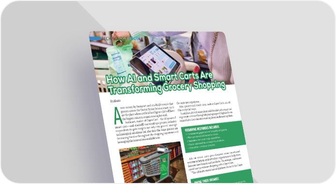 TECHNOLOGY FOCUS HHoow Aw AI aI annd Sd Smmarart Ct Carartts As Arree TTrraannssffoorrmmiingng G Grroocceerryy S Shohoppppiingng By Abasto new survey by Instacart and studioID reveals that the customer experience. grocers across the United States believe smart carts Also, grocers said smart carts, such as Caper Carts, can do are the place where arti昀椀cial intelligence (AI) will have this in myriad ways. the biggest industry impact moving forward. In addition, 85% of respondents said the ability of a smart cart A Instacart, maker of Caper Cart—the AI-powered to generate revenue through displaying targeted digital ads was smart cart—and studioID surveyed 150 grocery industry impactful to their decision-making about implementing them. respondents to gain insights not only into grocers’ strategic technological solutions but also into the ways grocers are decreasing friction throughout the shopping experience and Recurring responses included: leveraging the innovations available now. • Increased engagement with loyalty programs. • More personalized customer deals. • Seamless item scanning capabilities.. • Easier approaches to weighing produce. • Smoother checkout process. Ads on smart carts give shoppers more customized recommendations and introduce experiences to help them discover new brands and products. On average, customers spend over 30 minutes shopping with a Caper Cart. “吀栀e ultimate omnichannel platform for us is the Caper Among Those Avenues: • Average basket size. The Importance of AI and Smart • Capturing valuable customer data (where permitted by Carts in the Retail Industry: applicable laws and contract terms). Current AI usage focuses largely on operations such as • Analyzing shopping patterns and trends to optimize store monitoring produce freshness or detecting out-of-stock items. layouts. Grocers believe AI will soon take on an increasingly customer- • Positioning themselves as innovative and customer facing role, including personalizing ads and promotions. focused. 60% of survey respondents believe smart carts will soon be the most impactful application for AI in grocery retail. “With Caper Carts, we’re able to leverage technology to bridge Cart’s screen,” said Chris McCrae, Retail Technology and the online and in-store shopping experience. We’re taking Innovation Lead at Wakefern Food Corp. what customers love about shopping online and blending it Wakefern is the parent company for approximately 380 with their favorite parts of shopping in-store,” said Ahmed stores across a half-dozen banners and deploys smart carts at Beshry, Caper Co-Founder and Senior Director of Business many of its ShopRite stores. Development at Instacart. Instacart said that Caper Carts are or will soon be deployed In the survey, 47% of respondents emphasized the “high across North American retailers, including Bristol Farms, priority” of ensuring that new technology integration enhances Fairway Market, Geissler’s, and Kroger, among others. 2424 NNOOVVEEMMBBEERR/ D/ DECECEEMMBBEER 2R 200224 4 AABBAASSTOTO..CCOOMM
