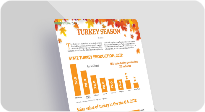 USEFUL DATA TTURURKKEEYY S SEEAASSONON By Abasto he Turkey is a classic food in the United States. and friends together around a table full of food, with the 吀栀is bird has become a culinary symbol, especially turkey as the undisputed star. Turkey meat production in Tassociated with 吀栀anksgiving. 吀栀is holiday, celebra- the United States during January–September 2023 was 4.11 ted on the fourth 吀栀ursday of November, brings families billion pounds, up about 5 percent from a year earlier. STATE TURKEY PRODUCTION, 2022: (in millions) U.S. total turkey production: 210 millones 0 7. .0 1.7 3 8 .0 .0 0 3 1 7 2 6 0 . 7. 2 2 7. 1 15 Minnesota North Arkansas Indiana Missouri Virginia Iowa Pennsylvania Carolina Source: Economic Research Service of U.S. Department of Agriculture Sales value of turkey in the the U.S. 2022: Type of cut Sources: Winsight Grocery Business; IRI Statistic Additional information: United States; IRI; 52 weeks ended October 9, 2022 1212 NNOOVVEEMMBBEERR/ D/ DECECEEMMBBEER 2R 200224 4 AABBAASSTOTO..CCOOMM