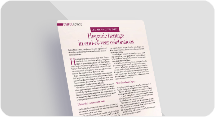 40�NOVEMBER / DECEMBER 2025 ABASTO.COM By Ana María Triana, consultora en bienestar organizacional, desarrollo organizacional y humano, conferencista en salud mental y bienestar. H ispanics carry celebrations in their souls. Tey are cheerful, festive, and family-oriented. Te preser- vation of generational legacies and identity trans- cends borders. With the living fame of Christmas and New Year’s in their hearts, they decorate their homes with color and symbols such as the nativity scene, and express unique customs that only fourish at this time of year. Every December, Hispanics in the United States transform their homes into a bridge connecting their traditions of origin with the land they now inhabit. Even though they are far away, they recreate the dishes that have marked generations, beco- ming symbols of identity, memory, and unity. Tis tradition would not be possible without the fundamental role of supermarkets and ethnic stores, which supply communi- ties with the ingredients necessary to keep their customs alive. More than just shopping destinations, they are guardians of co- llective memory: places where favors, colors, and aromas capable of transporting families to their homeland can be found. Dishes that connect with roots Traditional dishes vary from country to country. Roast tur- key and pork, as well as pork rolls with vegetables and spi- ces, are common on many tables. In Mexico, Christmas dinner includes cod; in the Domi- nican Republic, pasteles en hojas are served; in Colombia and Mexico, corn tamales with pork; and in Venezuela, the ever-present hallaca (a type of stufed corn dough). Suc- kling pig is enjoyed in Cuba and Puerto Rico, accompanied by rice with chicken. Te side dishes complete the abundance: sweet salads with pineapple or apple, the traditional Russian salad, co- lorful rice dishes, Venezuelan ham bread, or Peruvian pane- ttone flled with candied fruit. In Colombia, corn and cheese fritters, accompanied by milk and cinnamon-favored custard, are symbols of the season. Desserts include fans garnished with fruit, crispy chu- rros with powdered sugar, tres leches cake, Mexican choco- late pie with a touch of chili, and the traditional orange-fa- vored rosca de reyes. More than just recipes, each of these dishes is loaded with memories, roots, and a sense of belon- ging that transcends borders. More than food, a legacy Every Hispanic table celebrates more than just dinner: it ce- lebrates life, family, and the hope of a new beginning. Hispanic end-of-year celebrations are a mosaic of traditions that keep cultural identity alive. In every tamale, hallaca, nati- lla, or pan de jamón, there is much more than a dish: there is nostalgia, childhood memories, and the certainty that, around the table, family unity remains at the center. May this season remind us of the importance of gathe- ring, sharing, and giving thanks, keeping alive the tradi- tions that make us unique and sowing hope for a new year full of joy and prosperity in every home. Happy holidays, and may the new year be flled with heal- th and unforgettable moments! Hispanic heritage in end-of-year celebrations TRADITIONS AT THE TABLE: 40�NOVEMBER / DECEMBER 2025 ABASTO.COM USEFUL ADVICE