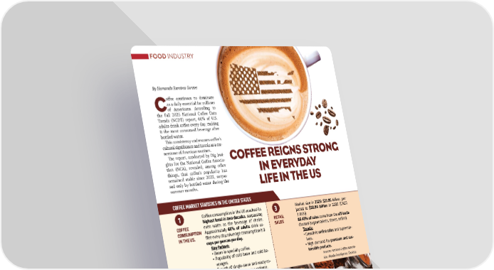 66�NOVEMBER / DECEMBER 2025 ABASTO.COM COFFEE REIGNS STRONG IN EVERYDAY LIFE IN THE US COFFEE MARKET STATISTICS IN THE UNITED STATES Cofee consumption in the US reached its highest level in two decades, surpassing even water as the beverage of choice. Approximately 66% of adults drink co- fee every day.nAverage consumption is 3 cups per person per day. Key factors: • Boom in specialty cofee. • Popularity of cold brew and cold be- verages. • Growth of single-serve and ready-to- drink (RTD) cofee for convenience. Sources: National Cofee Associa- tion, Mordor Intelligence, Statista. Market size in 2025: $23.96 billion, pro- jected to $28.94 billion in 2030 (CAGR 3.85%). 86.43% of sales come from the of-trade channel (supermarkets, stores, online). Trends: • Growth in online sales and supermar- kets. • High demand for premium and sus- tainable products. Sources: National Cofee Associa- tion, Mordor Intelligence, Statista. Specialty cofee: Growing at an annual rate of 6.83% through 2030, driven by consumers seeking quality, single origin, and sustainability. Conventional cofee: Still accounts for 53.35% of the market (2024). By format: • Ground cofee: 38.6% of the market. • Capsules and pods: fastest-growing segment (CAGR 5.73%). Beverage preferences: • Lattes and cappuccinos have grown by 50% since 2015. • Medium roast is the most popular. • Cold cofee is 50% more popular on the West Coast than in the South. Sources: National Cofee Associa- tion, Mordor Intelligence, Statista The U.S. is the world’s leading cofee im- porter, with imports worth $9 billion in 2024. 80% of imported green cofee comes from Latin America (Brazil, Colombia, Central America). Recent factors: • Tarifs and trade tensions have crea- ted uncertainty, but demand remains high. • Brazil and Colombia are the main su- ppliers, with Guatemala and Hondu- ras also playing a significant role. Sources: National Cofee Associa- tion, Mordor Intelligence, Statista. COFFEE CONSUMPTION IN THE US. RETAIL SALES PREFERRED TYPES OF COFFEE COFFEE IMPORTS 2 4 1 3 By Hernando Ramírez-Santos C ofee continues to dominate as a daily essential for millions of Americans. According to the Fall 2025 National Cofee Data Trends (NCDT) report, 66% of U.S. adults drink cofee every day, making it the most consumed beverage after bottled water. Tis consistency underscores cofee’s cultural signifcance and its role as a cor- nerstone of American routines. Te report, conducted by Dig Insi- ghts for the National Cofee Associa- tion (NCA), revealed, among other things, that cofee’s popularity has remained stable since 2022, surpas- sed only by bottled water during the summer months. FOOD INDUSTRY