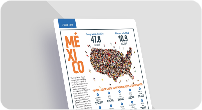 30�NOVEMBER / DECEMBER 2025 ABASTO.COM TOP TEN COUNTIES WITH MOST MEXICAN POPULATION IN THE USA: CARACTERÍSTICAS DE LA POBLACIÓN MEXICANA EN EE. UU. Te population shrank by more than 1 million people from its peak of 11.7 million in 2010 to 10.7 million in 2022 but has started growing again, according to the Migration Policy Institute (MPI). And Mexicans are the largest group of new U.S. green-card holders and naturalized citizens. Yet between 2005 and 2014, the number of Mexicans leaving the United States outpaced the number of new arrivals, according to Pew Research Center estimates. Immigrants in the USA: 47.8 MILLION Mexicans in the USA: 10.9 MILLION Los Angeles, California 1,152,600 Riverside, California 304,000 Dallas, Texas 308,700 San Bernardino, California 250,400 Cook, Illinois 390,200 Orange, California 291,100 Harris, Texas 458,700 San Diego, California 300,300 Maricopa, Arizona 305,200 Hidalgo, Texas 212,000 1 6 4 9 3 8 2 7 5 10 Bachelor’s Degree or Higher: 23% 47 years old 180,500 $64,500 USEFUL DATA Average Age: ������������������� Median Household Income: Legal Permanent Residents (Green Card Holders): U.S. Citizens: 34% High School Graduates: 27% 65%