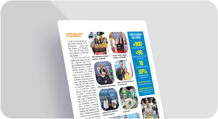 ABASTO.COM NOVIEMBRE / DICIEMBRE 2025 83 XITO GLOBAL EN CIFRAS +900 empresas expositoras +90 pases representados por compradores 18 pabellones de pases 30% de la asistencia fue internacional Pas de honor: Espaa, con ms de 69 empresas Segundo pabelln ms grande: Turqua, con ms de 50 empresas RAZONES PARA ASISTIR AL AF&B SHOW 2026 Cuando se les pregunt por qu asistir a la feria, los or- ganizadores reafirmaron que Miami y la Americas Food and Beverage Show and Conference son un mer- cado global. La feria era conocida an- teriormente como un mer- cado regional. Aqu tene- mos compradores de ms de 90 pases de todo el mundo. Buscan productos nuevos e interesantes. La mayor parte de las empresas ex- positoras son pequeas y medianas empresas que son muy innovadoras. Siempre traen algo diferente y nuevo al mercado, nuevos sabo- res, en particular sabores latinos, todo lo que viene en cuanto a comidas prepa- radas, mariscoslo vemos todo aqu. Tambin bota- nas, bebidas, ccteles; todo tipo de bebidas vienen a la feria. Tenemos escenarios de demostracin no solo de comida, sino tambin de be- bidas. Constantemente pre- sentamos nuevos productos y eso es lo que los compra- dores estn buscando, dijo Ancona. Asistir a la Americas Food and Beverage Show and Con- ference 2026 significa encon- trar algo nuevo, diferente, interesante, algo nuevo para llevar al mercado, para que el mundo lo disfrute y para pre- sentrselo al mundo. Adems, es una gran feria comercial para venir a comer y beber. Guillermo Montiel, Marco Pacheco y Gabriel Porciani, de Arcor. Jess Daz y Paola Salinas, de CS International. Vima Foods Guillermo Corona y Luis Alfonso Garca, de Salsa Huichol. Georgina Macas y Miguel Tostado, de GEOMMAG. Leticia Gonzlez, de Conzeptos. Johnny Hwang y equipo de Pocas International. Sandra Corts y Valentina Carrillo, de Innercia. Global Trade Bridge Corp Sylvia Menndez y Dionisio Martnez, de YAEST.