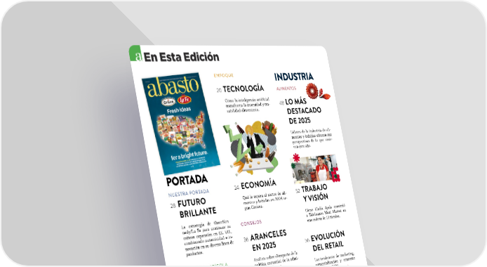 4 NOVIEMBRE / DICIEMBRE 2025 ABASTO.COM En Esta Edicin NUESTRA PORTADA PORTADA CONSE JOS ENFOQUE ALIMENTOS INDUSTRIA INDUSTRIA AGRCOL A 42 BRIGHTER BITES El sector agrcola respalda la lucha contra la inseguridad ali- mentaria. 28 FUTURO BRILLANTE La estrategia de GraceKen- nedy/La Fe para continuar su exitosa expansin en EE. UU., combinando autenticidad e in- novacin en su diversa lnea de productos. 20 TECNOLOGA Cmo la inteligencia artificial transforma la inocuidad y tra- zabilidad alimentaria. 48 LO MS DESTACADO DE 2025 Lderes de la industria de ali- mentos y bebidas ofrecen sus perspectivas de lo que vivie- ron este ao. 56 EVOLUCIN DEL RETAIL Las tendencias de marketing, comercializacin y consumo hispano en 2025. 36 ARANCELES EN 2025 Anlisis sobre el impacto de la poltica comercial de la admi- nistracin Trump. 24 ECONOMA Qu le espera al sector de ali- mentos y bebidas en 2026 se- gn Circana. 52 TRABAJO Y VISIN Cmo Eladia Ayala convirti a Teloloapan Meat Market en una cadena de 11 tiendas. 60 MARQUE LA DIFERENCIA Herramientas para triunfar en la temporada de fiestas con la IA. 44 DE FRESCAS A CONGELADAS Cmo durante las ltimas dca- das ha cambiado el suministro anual de papas en EE. UU. 40 TRADICIONES A LA MESA La herencia hispana en las celebraciones de fin de ao.