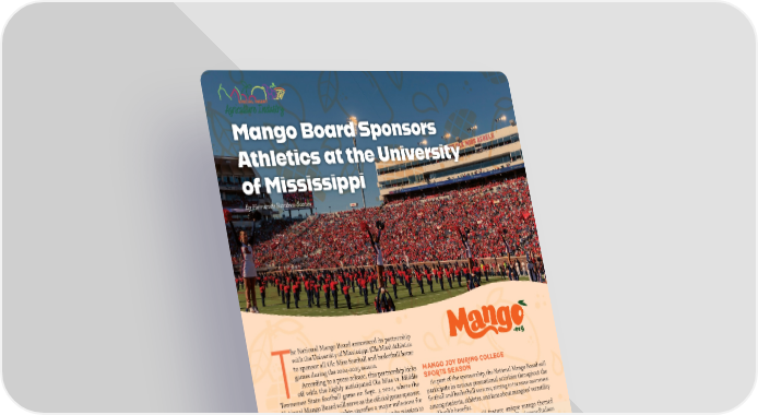 Mango Board Sponsors Athletics at the University of Mississippi By Hernando Ramírez-Santos he National Mango Board announced its partnership with the University of Mississippi (Ole Miss) Athletics to sponsor all Ole Miss football and basketball home games during the 2024-2025 season. According to a press release, this partnership kicks MANGO JOY DURING COLLEGE To昀昀 with the highly anticipated Ole Miss vs. Middle SPORTS SEASON Tennessee State football game on Sept. 7, 2024, where the As part of the sponsorship, the National Mango Board will National Mango Board will serve as the o昀케cial game sponsor. participate in various promotional activities throughout the 吀栀is enhanced partnership signi昀椀es a major milestone for football and basketball seasons, aiming to increase awareness the National Mango Board, further integrating its mission to among students, athletes, and fans about mangoes’ versatility promote the health bene昀椀ts and delicious taste of mango with and health bene昀椀ts. the vibrant energy of collegiate sports. Each home game will feature unique mango-themed experiences, making every visit to Vaught-Hemingway Stadium THE JOY OF MANGO DURING and the SBJ Pavilion at Ole Miss memorable. COLLEGE SPORTS SEASON “We are thrilled to expand our collaboration with the Fans can taste the joy of mangos during a season 昀椀lled with National Mango Board to include all home games for both activities, engaging promotions, and numerous opportunities football and basketball,” said Chris Helsel, general manager to sample this tropical fruit at select home games. of Ole Miss Sports Properties. “吀栀eir dedication to promoting “We look forward to kicking o昀昀 our partnership with Ole Miss healthy living aligns perfectly with our values, and we look Athletics, extending our support to all football and basketball forward to a successful partnership that bene昀椀ts our fans and home games for the 2024-2025 season. 吀栀is collaboration allows student-athletes throughout the entire season.” us to celebrate the joy of mango with an even larger audience. All Ole Miss Athletics sponsorship agreements are managed We look forward to engaging with the Ole Miss community by athletic multimedia rights holder Ole Miss Sports Properties, and enhancing their game-day experiences with our refreshing the locally based team of Lear昀椀eld, the media and technology fruit. Hotty Toddy!,” said Dan Spellman, marketing director for company powering college athletics. the National Mango Board. 1010 SSEEPPTTEEMMBBEERR//OOCCTTOOBBEERR 22002244 -- AABBAASSTTO.CO.COOMM