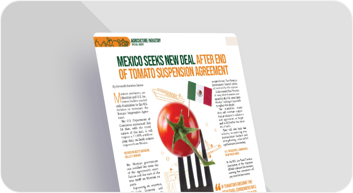 8�SEPTEMBER / OCTOBER 2025�ABASTO.COM SPECIAL INSERT Agriculture industry By Hernando Ramírez-Santos M exican producers, au- thorities and U.S. bu- siness leaders reacted with frustration to the U.S. decision to terminate the Tomato Suspension Agree- ment. Te U.S. Department of Commerce announced July 14 that, with the termi- nation of the pact, it will impose a 17.09% antidum- ping duty on fresh tomato imports from Mexico. MEXICO REJECTS DECISION, CALLS IT UNFAIR Te Mexican government was notifed the same day of the agreement’s cance- llation and the start of the new tarif on Mexican ex- ports. Expressing its rejection, Mexico’s Economy and Agriculture ministries ca- lled the measure “unfair” and harmful to both na- tions. “Te U.S. market has em- braced Mexican tomatoes for their quality, not becau- se of unfair practices,” the Mexican government said in a statement. It recalled that since 1996, U.S. producers have alleged dumping, though the process was suspended fve times, most recently in 2019. Over the past 90 days, the Mexican government su- pported its tomato growers in negotiations with U.S. authorities and producers. However, despite seve- ral constructive proposals from Mexico, the U.S. side MEXICO SEEKS NEW DEAL AFTER END OF TOMATO SUSPENSION AGREEMENT accepted none. Te Mexican government blamed politi- cal motives for the rupture. It also warned that “two out of every three tomatoes con- sumed in the U.S. come from Mexico,” making it impossible to replace that supply. Te ministries stated they will continue suppor- ting producers to achieve a new agreement, as happe- ned in 2019 after four mon- ths of talks. Tey will also back the industry in exploring new international markets and strengthening value-added agribusiness processing. U.S. PRODUCERS, LAWMAKERS FEAR PRICE HIKES In the U.S., the Fresh Produce Association of the Americas (FPAA) criticized the decision, warning that consumers will pay more for less variety. Texas is among the most afected states, said Repre- sentative Vicente González, who fears shortages and price increases nationwide. “Te Rio Grande Valley depends on this trade,” the congressman said. “Tis measure jeopardizes over 30,000 jobs in Texas.” State Representative Ryan Guillen estimated that Texas could lose up to $4.5 billion in economic ac- tivity without the Tomato Suspension Agreement. UP TO $4.5 BILLION COULD BE LOST IN ECONOMIC ACTIVITY IN TEXAS WITHOUT THE TOMATO SUSPENSION AGREEMENT. 8�SEPTEMBER / OCTOBER 2025 ABASTO.COM MEXICO SUPPLIES 70% OF THE FRESH TOMATOES CONSUMED I N THE U.S. IF TOMATOES BECOME THE NEW EGGS, CONSUMERS WILL PAY MORE. THIS HURTS OVER 50,000 JOBS”.