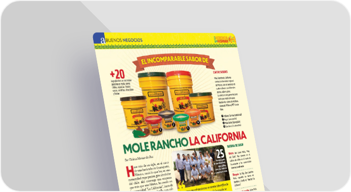 ���SEPTIEMBRE / OCTUBRE 2025�ABASTO.COM BUENOS NEGOCIOS Por Violeta Montes de Oca H ace más de un siglo, en el casco de una hacienda en Guanajuato, México, nació lo que hoy es una comunidad cuya pasión gira alrededor del chile. Ahí converge una empresa que más que una fábrica, ha creado en la comunidad “La California”, lazos de familia, haciendo un platillo con cali- dad de exportación: Mole Rancho La California. ESTE PRODUCTO SABE A FAMILIA, FIESTA, TRADICIÓN Y RAÍCES La receta de “Mole Rancho La Califor- nia” conjuga con chiles criollos secos, cultivados por la misma comunidad desde hace más de un siglo y la receta que Don Casimiro Peña, hijo de Don León Peña, mejor conocido como El “Rey del Chile” compró a Doña Lupita, una mujer en Puebla autora del mejor mole. El conocimiento innato del chile que tienen los habitantes de la comunidad La California y la sazón incomparable de las mujeres resultan en un mole que enamora con su sabor a personas en Estados Unidos, América Latina y Europa. MOLE RANCHO LA CALIFORNIA HISTORIA DE SABOR 1910: Don León Peña, “Rey del Chile”, fue pionero en el cultivo de chiles en el norte de Guanajuato y los comercializó internacionalmente Legado: Su hijo, Don Casimiro Peña, expandió las tierras de siembra y fundó el “Rancho La California”. Nueva Generación: Jaime Peña (hijo de Don Casimiro), su esposa Cecilia Grande y sus hijas Cecilia y Carolina, transformaron los chiles en “Mole Rancho La California”. CUATRO SABORES Mole Rancho La California celebra la diversidad regional de México, con un producto en cuatro sabores con diferentes aroma, sabor y picor. Los ofrece en tres presentaciones tanto para retail como para foodservice: cubeta de 44 libras, cubeta de 11 libras y PET de una libra. 1 Poblano (el más tradicional) 2 Negro (oaxaqueño) 3 Mole Verde (tipo pipián) 4 Ranchero (el coloradito) EL IN COMP ARAB LE SA BOR D E 2 3 4 +20 ingredientes se necesitan para hacer mole, como chiles, especias, frutos secos, semillas, chocolate y frutas Buscamos que el mexicano se sienta identifcado con nuestro producto, que cuando lo pruebe se acuerde de su hogar, de su comunidad y de su familia. Buscamos enamorar a todos con el sabor de nuestra tierra y de la herencia que tenemos como productores de chile” Carolina Pena Grande / Encargada de ventas internacionales 25 forman parte de la comunidad. que cultiva, cosecha, elabora y sazona el mole 64 variedades de chile existen en México. Sin embargo, la cifra podría superar las 200 al considerar las subespecies y variedades criollas. 2010 es el año en el que la UNESCO declaró a la gastronomía mexicana patrimonio cultural inmaterial de la humanidad. Uno de los platillos que lo hizo posible fue el mole. 1 ���SEPTIEMBRE / OCTUBRE 2025�ABASTO.COM