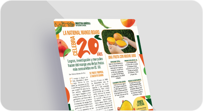 ���SEPTIEMBRE / OCTUBRE 2025�ABASTO.COM ���SEPTIEMBRE / OCTUBRE 2025�ABASTO.COM LA NATIONAL MANGO BOARD AÑOS CELEBRA Logros, investigación y mercadeo hacen del mango una de las frutas más consumidas en EE. UU. APARTA LA FECHA La National Mango Board celebrará su 20 aniversario con una Recepción de la Industria del Mango. Día: 17 de octubre Hora: 6:00 a 9:00 PM Lugar: 777 W Convention Way, Anaheim, CA 92802 Por Violeta Montes de Oca E l mango es alegría, sa- bor, nutrición y estra- tegia. Detrás de esta visión se encuentra la Na- tional Mango Board (NMB), que cumple 20 años de la- bor exitosa, celebrándolo con logros tangibles y una recepción en octubre. La or- ganización, que busca unir a la industria para aumentar el consumo de mango fres- co en Estados Unidos, ha lo- grado que este fruto incre- mente su presencia en los hogares estadounidenses. Con motivo del 20 ani- versario, el director ejecu- tivo Ramón Ojeda enfatiza que la celebración es un momento para honrar a los visionarios que sentaron las bases de la NMB a princi- pios de 2000. El evento, que se llevará a cabo en octubre, reconocerá el liderazgo y el trabajo altruista de los pio- neros que contribuyeron a su fundación en 2005 y de todos los miembros que han impulsado su crecimiento en las últimas dos décadas. El evento es posible en parte gracias al apoyo de pa- trocinadores como Amazon Produce, Continental Fresh, CH Robinson, Coast Tropical, CAPCO, Mission Produce, GM Produce, RCF y Splendid. DE FRUTA TROPICAL A FAVORITO DIARIO En estos 20 años, la NMB ha desarrollado más de 140 proyectos de inves- tigación y 100 campañas publicitarias. Este trabajo ha permitido que el consu- midor disfrute del mango las 52 semanas del año y ha ayudado a destacar sus benefcios nutricionales. Como señala Ojeda, están enfocando sus campañas en la versatilidad y los benef- cios para la salud del man- go. Una porción de mango aporta fbra, vitamina B6 y más de 20 vitaminas, mine- rales y antioxidantes, todo con solo 70 calorías. Para 2030, la NMB tiene la visión de que el mango sea una parte integral de la dieta estadounidense, posi- cionándose como una de las 10 frutas más consumidas en el país. PRODUCCIÓN EN EE. UU. Las principales áreas de producción de mango en Estados Unidos incluyen el sur de Florida, el Valle de Coachella en California, Hawái y Puerto Rico. CONSUMO PER CÁPITA El consumo per cápita de mango ha crecido de 1.9 libras por persona en 2005 a 3.6 libras en 2023. Esto lo posiciona como la 11ª fruta más consumida en el país. PAÍSES EXPORTADORES 21 países tienen progra- mas fitosanitarios para exportar mango a EE. UU., entre ellos: México, Perú, Brasil, Ecuador, Guatema- la, Colombia, República Dominicana e India. UNA FRUTA CON MUCHO JUGO CONSUMO TOTAL Más de 1,200 millones de libras (550,000 toneladas métricas) de mango se consumen anualmente en EE. UU., generando un valor Free On Board (FOB) superior a los $900 millones.
