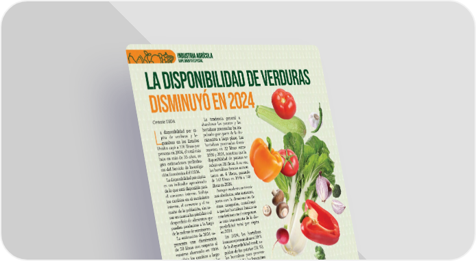���SEPTIEMBRE / OCTUBRE 2025�ABASTO.COM Cortesía USDA L a disponibilidad per cá- pita de verduras y le- gumbres en los Estados Unidos cayó a 376 libras por persona en 2024, el total más bajo en más de 35 años, se- gún estimaciones prelimina- res del Servicio de Investiga- ción Económica del USDA. La disponibilidad per cápita es un indicador aproximado de lo que está disponible para el consumo interno. Refeja los cambios en el suministro interno, el comercio y el ta- maño de la población, sin te- ner en cuenta las pérdidas o el desperdicio de alimentos que pueden producirse a lo largo de la cadena de suministro. La estimación de 2024 re- presenta una disminución de 50 libras con respecto al máximo alcanzado en 1996 y refeja los cambios a largo plazo en la producción y los patrones comerciales de las hortalizas. La tendencia general a abandonar las patatas y las hortalizas procesadas ha im- pulsado gran parte de la dis- minución a largo plazo. Las hortalizas procesadas dismi- nuyeron en 32 libras entre 1996 y 2024, mientras que la disponibilidad de patatas se redujo en 28 libras. A su vez, las hortalizas frescas aumen- taron en 6 libras, pasando de 142 libras en 1996 a 148 libras en 2024. Aunque modesto en térmi- nos absolutos, este aumento, junto con la disminución de otras categorías, contribuyó a que las hortalizas frescas se convirtieran en el componen- te más importante de la dis- ponibilidad total per cápita en 2024. En 2024, las hortalizas frescas representaban el 39 % de la disponibilidad total, se- guidas de las patatas (31 %), las hortalizas para procesa- miento (25 %), las legumbres (3 %) y las setas (1 %). LA DISPONIBILIDAD DE VERDURAS DISMINUYÓ EN 2024 DISPONIBILIDAD PER CÁPITA DE HORTALIZAS Y LEGUMBRES, 1996, 2010, 2024 P* LIBRAS POR PERSONA 450 350 250 150 50 400 300 200 100 0 1996 2010 2024 145 127 142 114 121 150 96 96 148 SETAS ALUBIAS SECAS, GUISANTES SECOS, LENTEJAS Y GARBANZOS PATATAS HORTALIZAS, PROCESADAS HORTALIZAS, FRESCAS 8 8 4 4 3 ���SEPTIEMBRE / OCTUBRE 2025�ABASTO.COM NOTA: *P= preliminar. Disponibilidad anual per cápita basada en los totales del año natural para hortalizas frescas y procesadas (excluidos los melones), legumbres y setas. Las hortalizas frescas incluyen las enlatadas, congeladas y secas, y excluyen las patatas, las legumbres y las setas. Las patatas incluyen las frescas y las procesadas. La categoría de legumbres incluye los guisantes de invierno austriacos y los guisantes arrugados, cuando procede. Los datos sobre setas se basan en el año agrícola comprendido entre julio y junio. FUENTE: USDA, Servicio de Investigación Económica, Perspectivas de las hortalizas y las legumbres.
